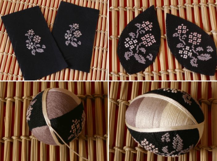 Техника, която често се използва в комбинация с канзаши. За целта е необходимо да покриете яйцето с конец, както направихте при изработката на великденското яйце от мъниста. Просто трябва да забиете клечки за зъби в горната и долната част на яйцето и да навиете конеца от едната до другата точка.