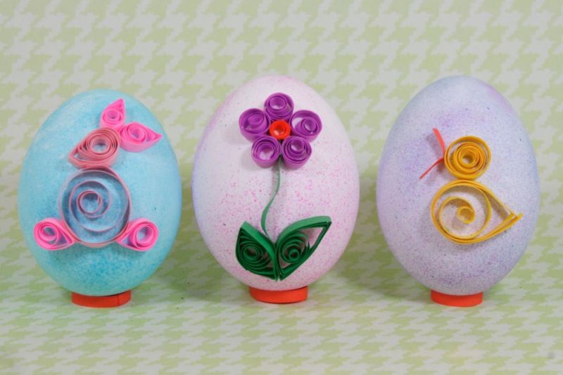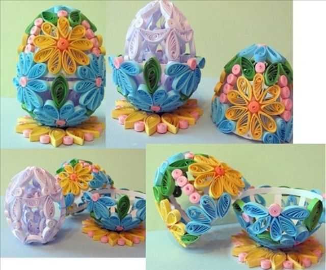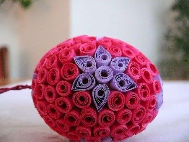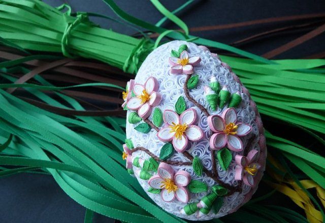 По този начин се изработват основните елементи на творението, които след това се прикрепят към повърхността на основата, за да се създадат различни композиции. Такова яйце, изцяло облицовано с "ролки" и "капчици", ще бъде чудесна украса за дома за Великден.