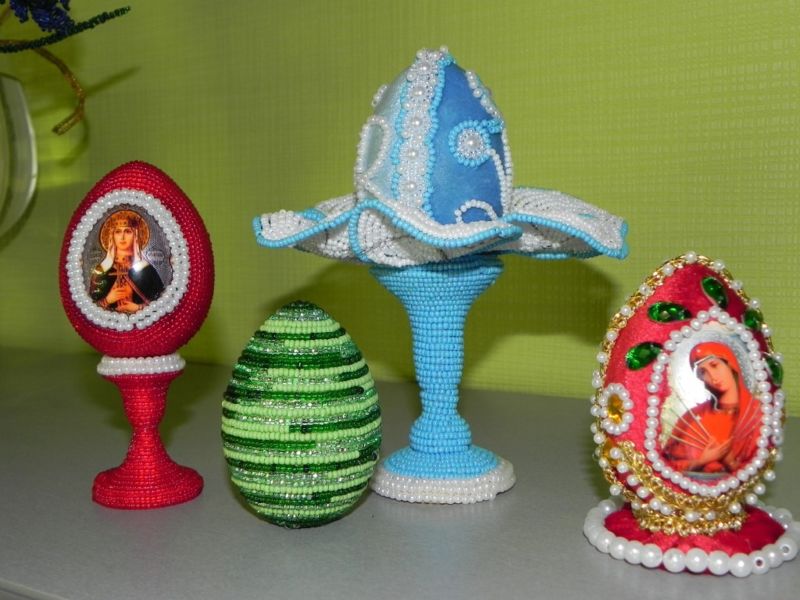 Въпреки че първият вариант е обичан от много занаятчии, но е труден за изпълнение (отчасти поради големия брой различни техники на тъкане), затова ще се спрем на втория. С помощта на игла нанижете мънистата на конеца и след това с помощта на прозрачно лепило внимателно ги залепете върху яйцето или детайла.