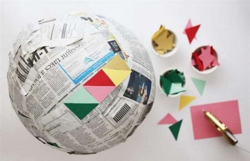 За тази пинята ви е необходима тоалетна хартия или вестници, нарязани на ленти или накъсани на парчета. Нарязаната на ленти хартия ще ви помогне да спестите време за направата на играчка-изненада. Залепете подготвената хартия към надутия балон, като използвате техниката папие-маше.