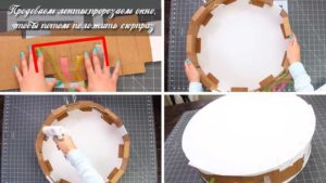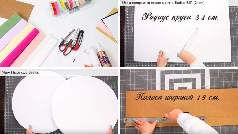 - Направете 2 кръга с радиус 24 см и лента с дължина, равна на дължината на кръга (приблизително 75 см), и широчина 18 см, от тежък картон (можете да вземете части от картонена кутия).