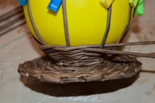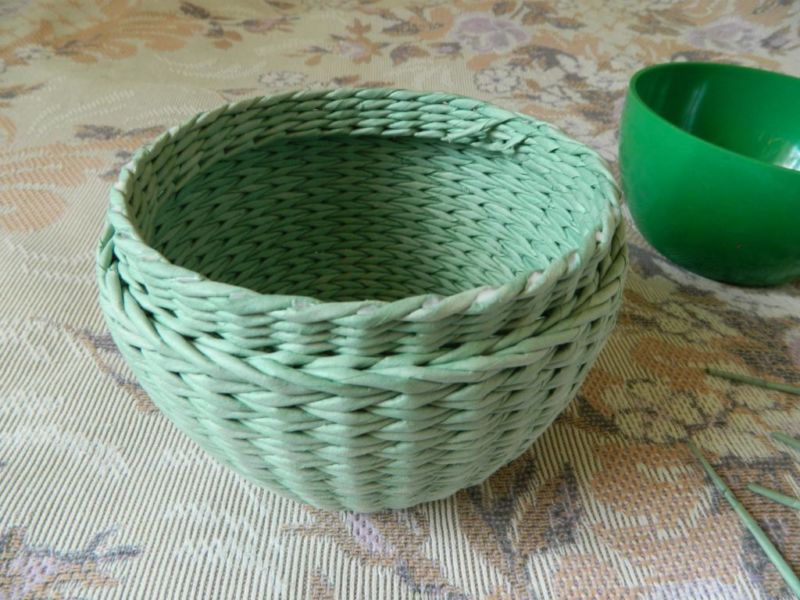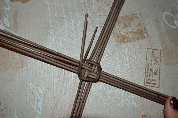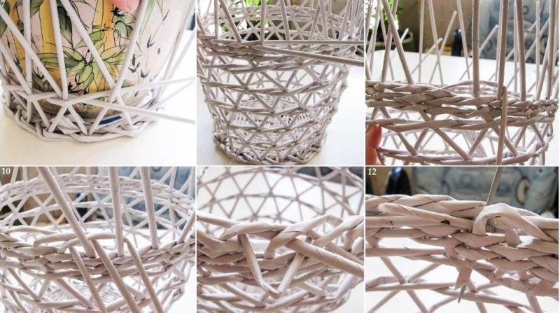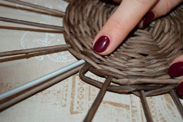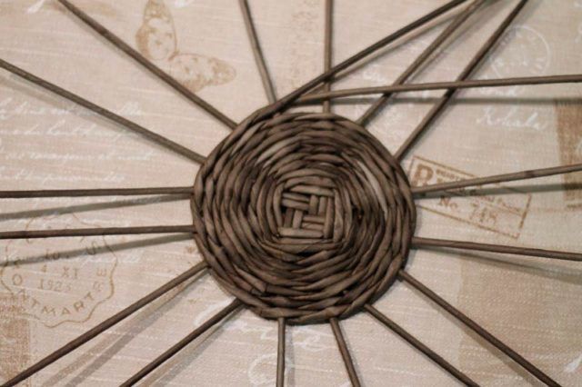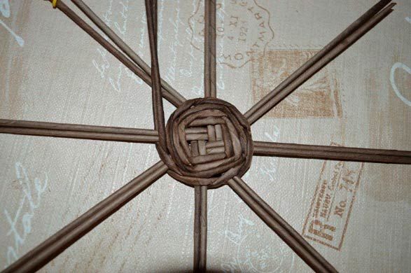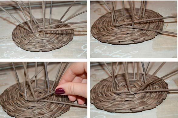 Вертикалните подпори се закрепват към дъното на коша - за предпочитане в нечетен брой. Те изпълняват важна функция при тъкането на декоративни стени. Изделието се плете, като се хваща най-широката част от хартиеното клонче, а останалите се подреждат постепенно в изделието.