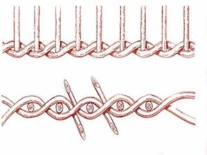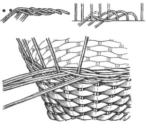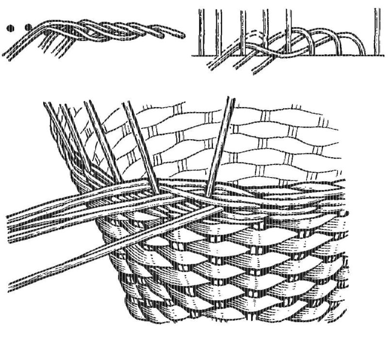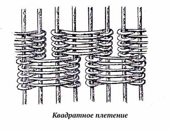 Преходът към следващия ред се извършва от всяка работна лоза, като се повтаря както в долния ред. С напредването на работата дължината на работните лози ще трябва да се увеличава, а накрая те ще бъдат обезопасени и отрязани. Редовете могат да се състоят от 2 или 3 пръчки, които се навиват на една пръчка, за да се получи сдвоен модел.