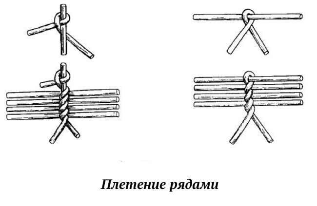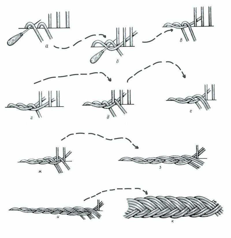 Основата на плетенето на въжетата е обвиването на стойките с ефектно преплитане на работещите лози. Въжето може да се направи на 2 стъбла:
