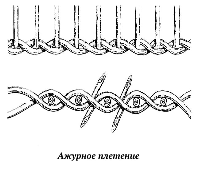 Ажурните свитъци или други декоративни елементи запълват пространството между лентите и преплитат стълбовете. Най-достъпният модел за начинаещи е ажурна плетка на ивици без преплитане, която може да се допълни с друг модел или да се остави частично без навивки.