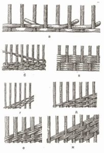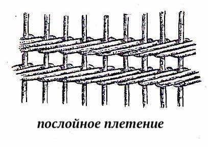 - Плоските клонки се преплитат през един стълб, като се поставят хоризонтално;