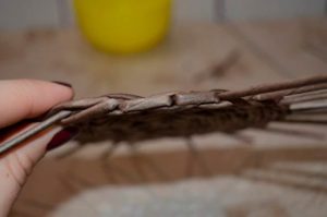 След като завършите един кръг, продължете нататък, но свободното клонче се увива не около 2, а около 4 сламки в долната част. Така разширяването на дъното е завършено. Повторете процеса няколко пъти, като създадете още редове. Заобикаляйки всеки стълб, продължете да разширявате долната част до желания формат.
