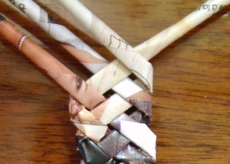 Изделието може да бъде завършено с наклонена плитка, както е показано на снимката на вестникарската тръба за плетене.