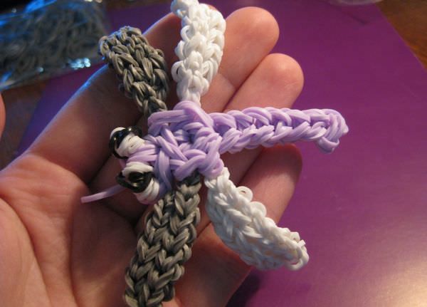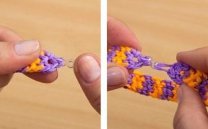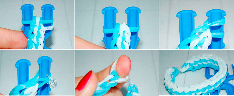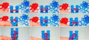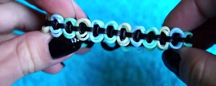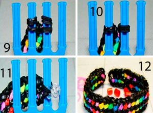 Направете същото и с втория среден зъб. След това се повтаря техниката на плетене, само че гумените ленти се опъват с пръстен, без да се пресичат по средата. Продуктът се сплита на плитка, докато достигне желаната дължина. За да направите красива гривна, вземете цветни части.