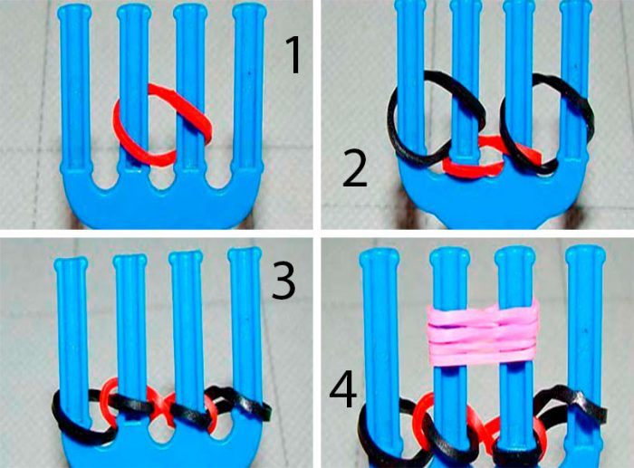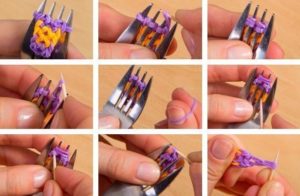 Друг популярен начин за плетене на гривни. За да го направите, вземете специален стан и гумени ленти в два цвята, например лавандула и фуксия. Сглобете тъкачния стан така, че колоните да гледат надясно и около три от тях в центъра да не са с крепежни елементи. ще използваме и кука.