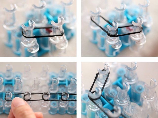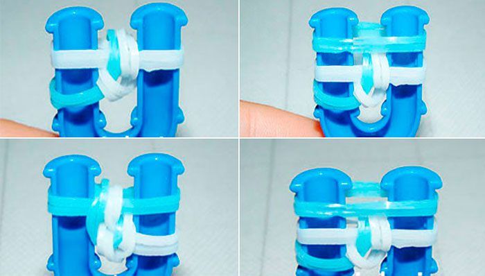 Сгънете един ластик наполовина и го усучете във формата на осмица, която поставяме върху средните зъбци на уреда. Покрай най-външните зъбци направете същото. Издърпайте още едно парче в средата. Сега вземете един пръстен и го поставете в центъра. От центъра вземете примката отдолу и я преместете нагоре.