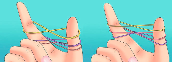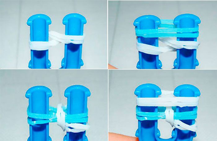 След това нахлузете още две гумени ленти последователно на двата пръста, като долната трябва да се отстрани от пръстите, така че да се премести в центъра - смело я издърпайте нагоре и върху пръста си. Ще получите първата верига.