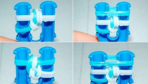 Внимателно вземете долния пръстен на една от примките вдясно и го преместете в центъра на прашката, повторете това и вляво. След това отново поставете новите гумени ленти върху устройството и прехвърлете примките на долния пръстен към центъра на устройството, както в случая с първия пръстен.