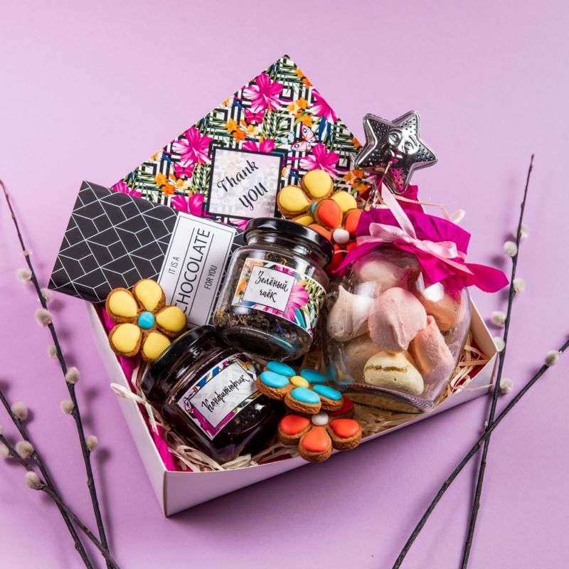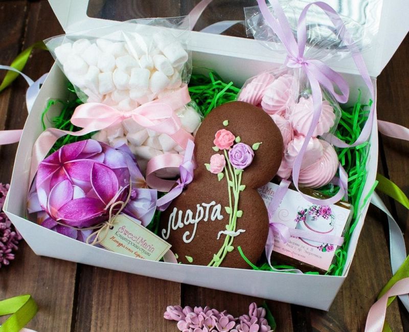 За по-възрастните дами можете да използвате същите варианти или да купите по-традиционна кутия с лакомства, ръчен мармалад или комплекти бонбони.