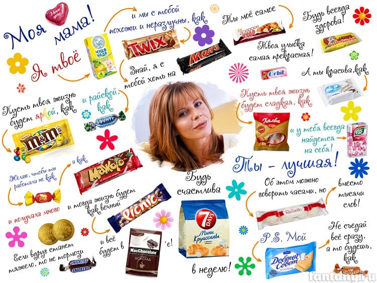 Ако желаете, можете да направите поздравителен плакат, като съставите фрази от бонбони и бонбонени пръчици.