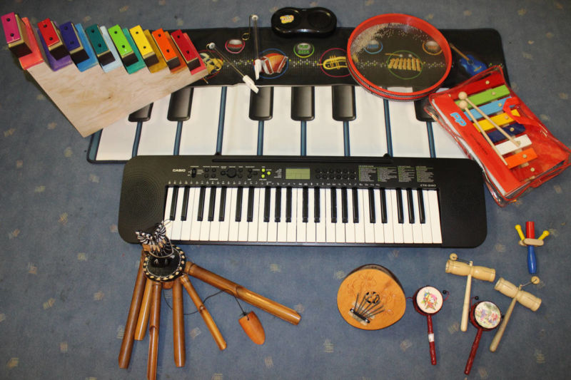 - музикални инструменти (барабан, ксилофон, хармониум, хармоника, пищялка, електронно пиано, тамбура, китара)