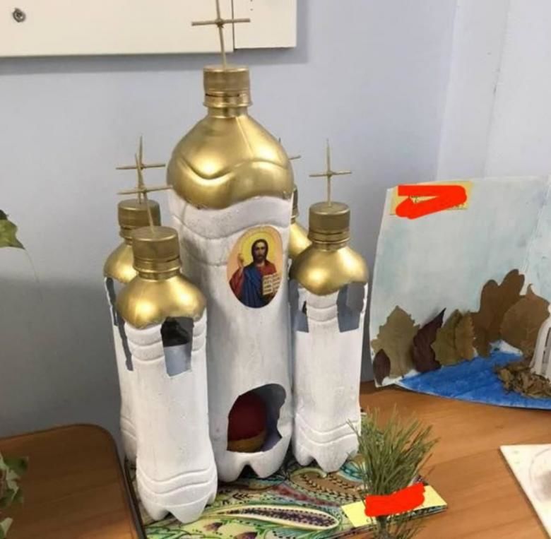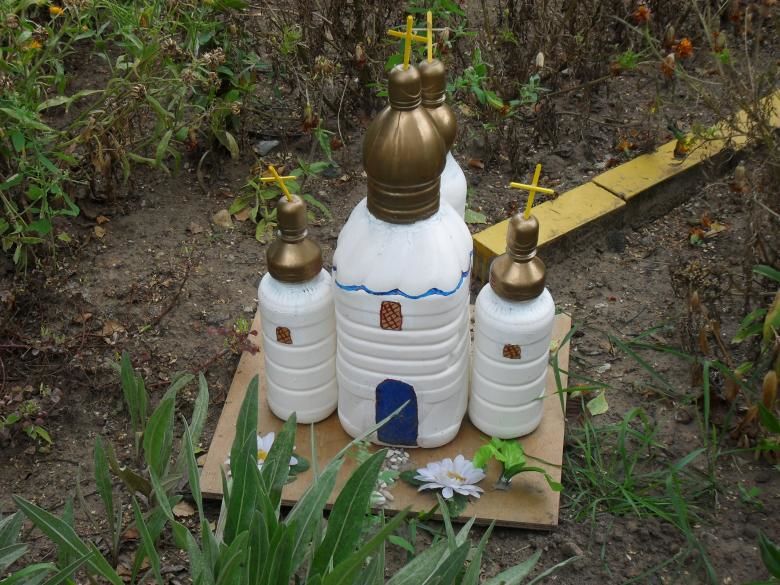 - Върху една от стените на бутилката нарисувайте контура на църква. Можете да добавите детайли под формата на купол, кръст, изрязани прозорци. Всички те ще трябва да бъдат изрязани по контура. Така ще се оформи силуетът на църквата.