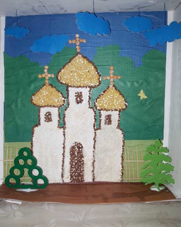 Какво правим. Нарисувайте църквата с молив. Нанесете слой лепило върху листа, поставете мънистата върху лепилото и изчакайте работата да изсъхне. Същото можете да направите и с грис, ориз, овесени ядки. След това просто боядисайте цветните части и изчакайте работата да изсъхне.