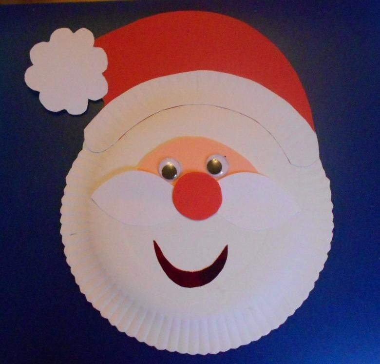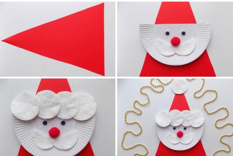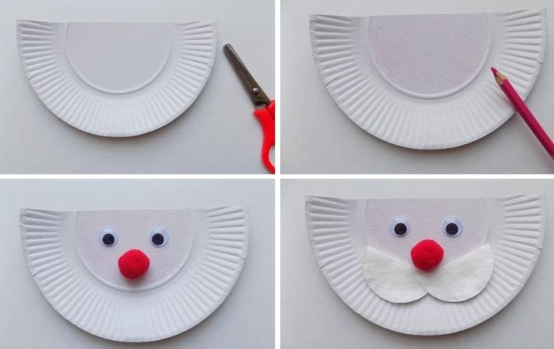 Много е лесно да направите Дядо Коледа от бяла чиния за еднократна употреба. Необходимо е да се изрежат от цветна хартия необходимите елементи като мустаци, усмивка, очи, червена шапка с бял помпон. Трябва да обърнете внимание и на създаването на малък бежов полукръг, който ще бъде лицето на героя.