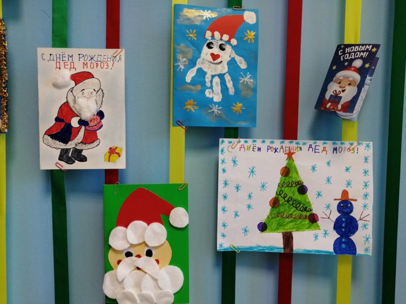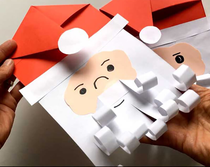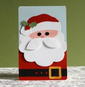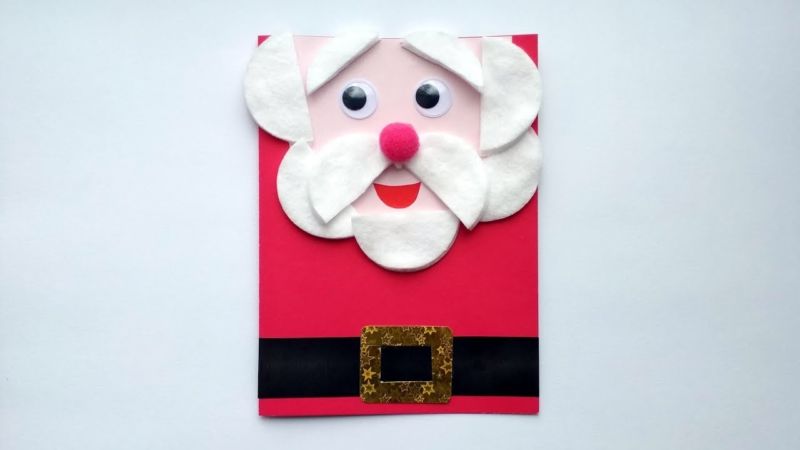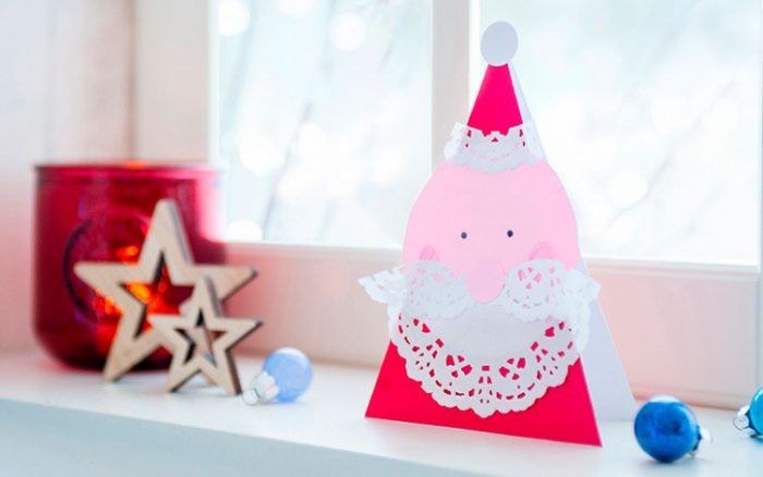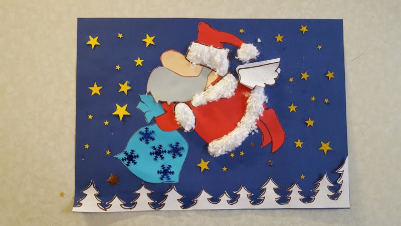 Поздравителна картичка с Дядо Коледа се изработва по същия модел като апликацията. Единствената разлика е, че когато залепите главния герой, фонът ще бъде картон, разположен наполовина.