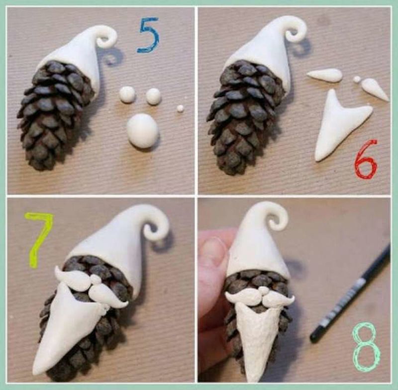 - Залепете брада от памучна вата. Оцветете шишарката в червено.