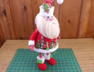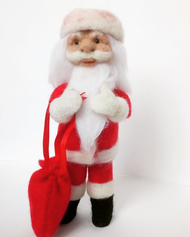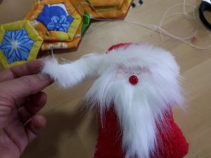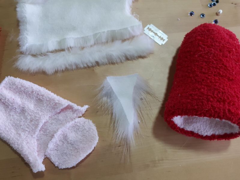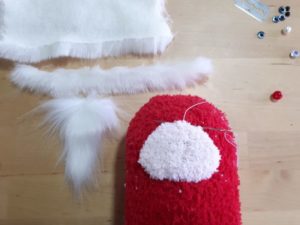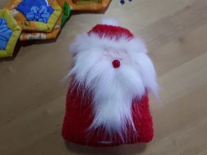 - Направете шапка от плат и я зашийте на главата. Декорирайте с бяла вълнена брада и мустаци, червен нос и очи с копчета.