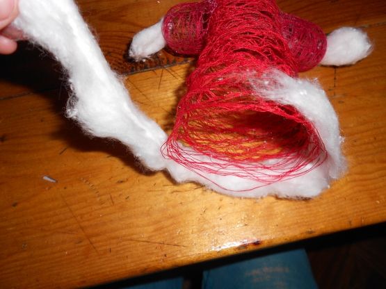За да направите празничен герой от чорапогащи, напълнете чорапогащите с пълнеж, например памучна вата:
