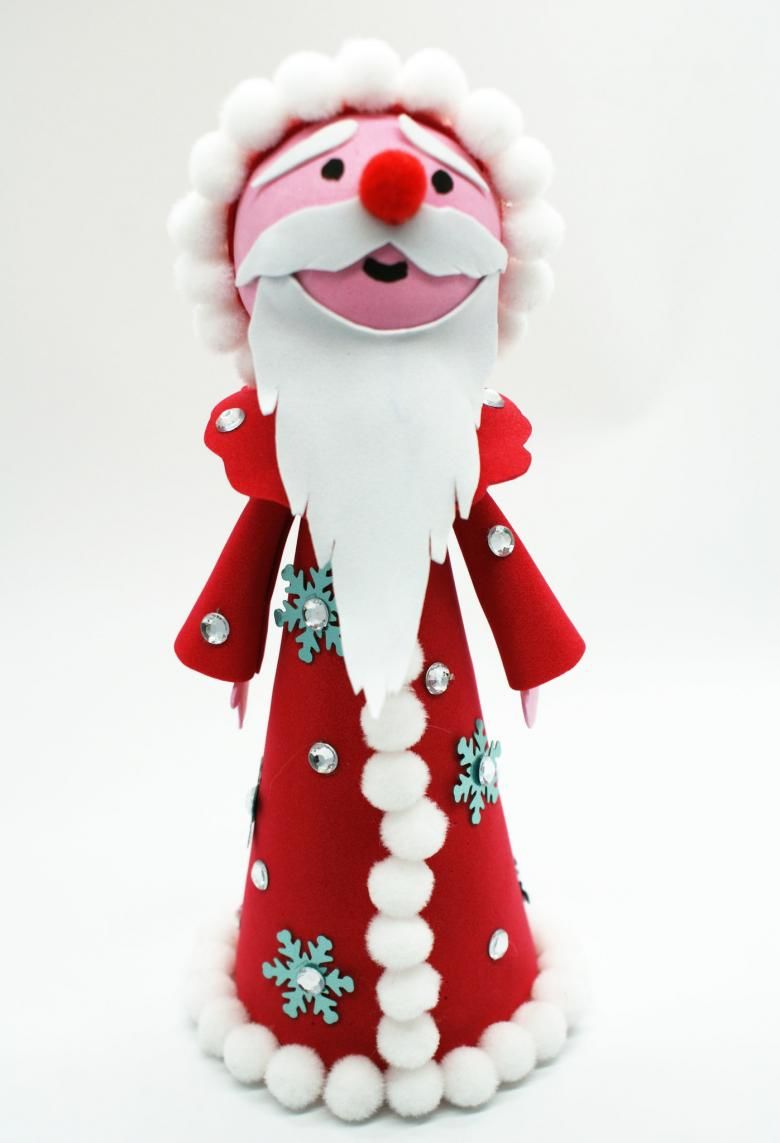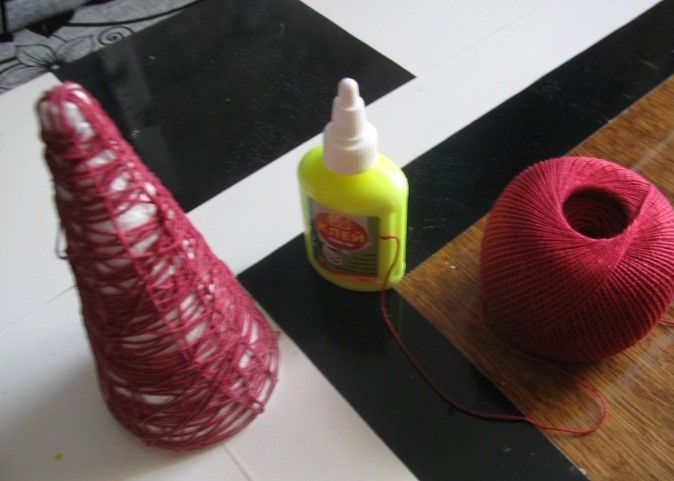 За да направим занаят от прежда, трябва да направим конус от картон. Навийте червения конец около конуса. Залепете апликация на лицето на Дядо Коледа от основата на конуса.