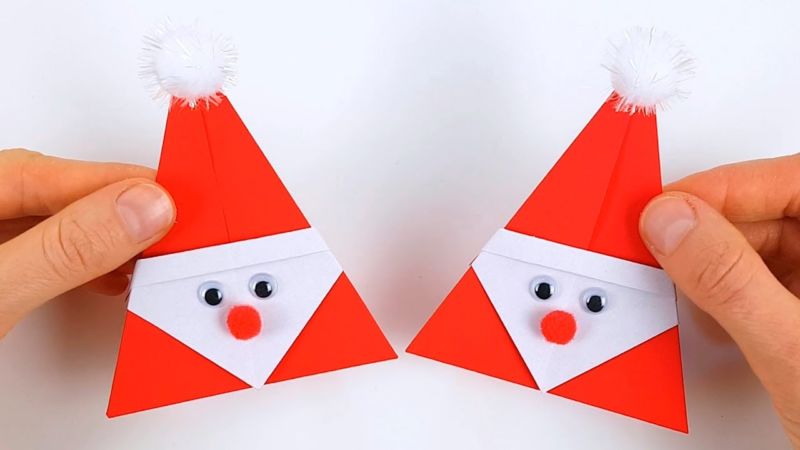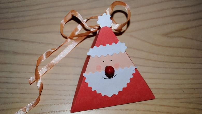 - От червената хартия изрежете два триъгълника. Един голям от тях ще бъде тялото на приказния герой. Вторият по-малък ще бъде шапката. Разбира се, не забравяйте за прословутия червен нос на Дядо Коледа. Той е изрязан под формата на червен кръг.
