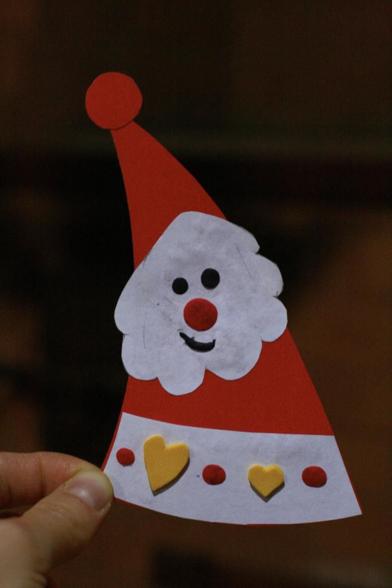 - Преминете към основната част и залепете всички части. Залепете най-големия триъгълник върху фона, който ще бъде торсът на Дядо Коледа. Прикрепи главата му към нея и към тази шапка.