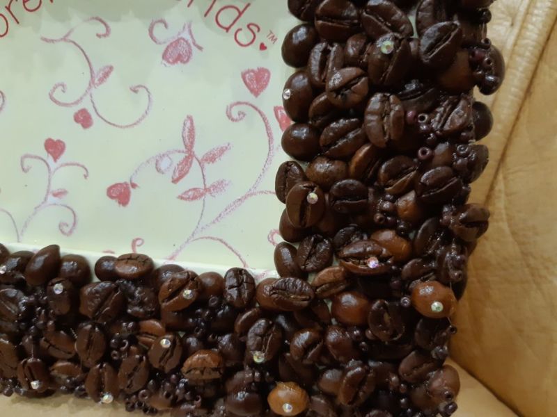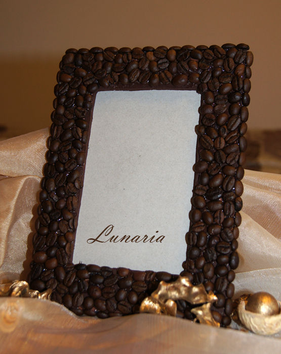 По-големите деца могат да опитат нещо подобно. Много по-трудно е да се направи рамка с кафе на зърна, отколкото с копчета или моливи, тъй като всички елементи са доста малки.