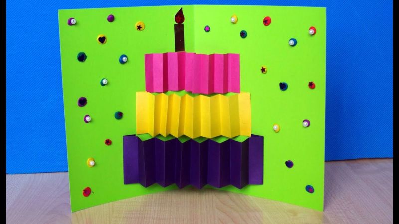 - Сега сгънете и разгънете белия лист, така че линиите на тортата да са по-остри. Време е да добавите детайли, така че можете да започнете да изрязвате свещи, малки декорации и други подобни от цветна хартия. Залепете ги всички върху тортата.