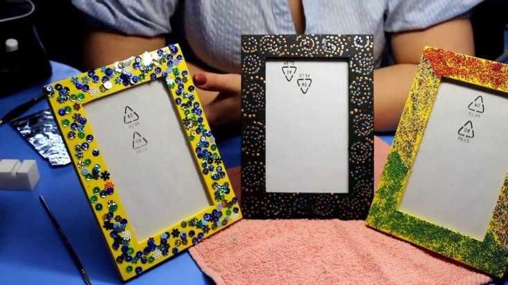 Една обикновена, скучна рамка може да бъде украсена с всичко, което можете да намерите под ръка. Ето няколко примера за изделия, изработени от някои от материалите.
