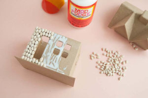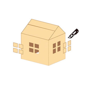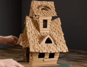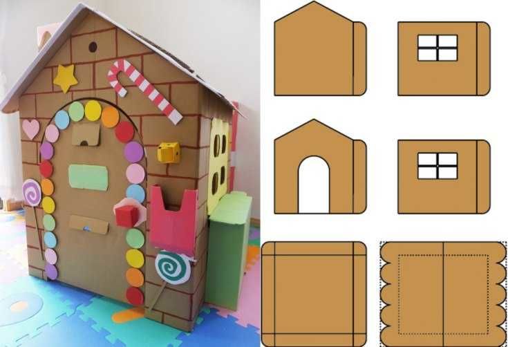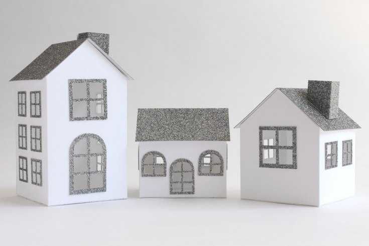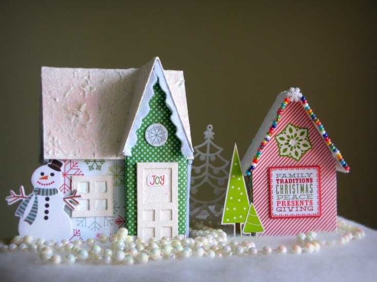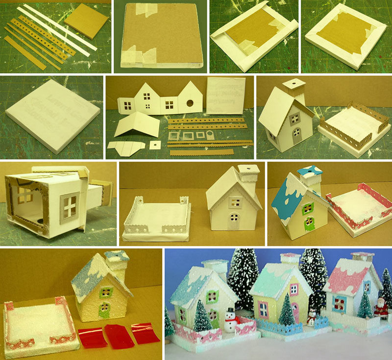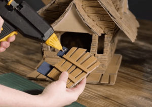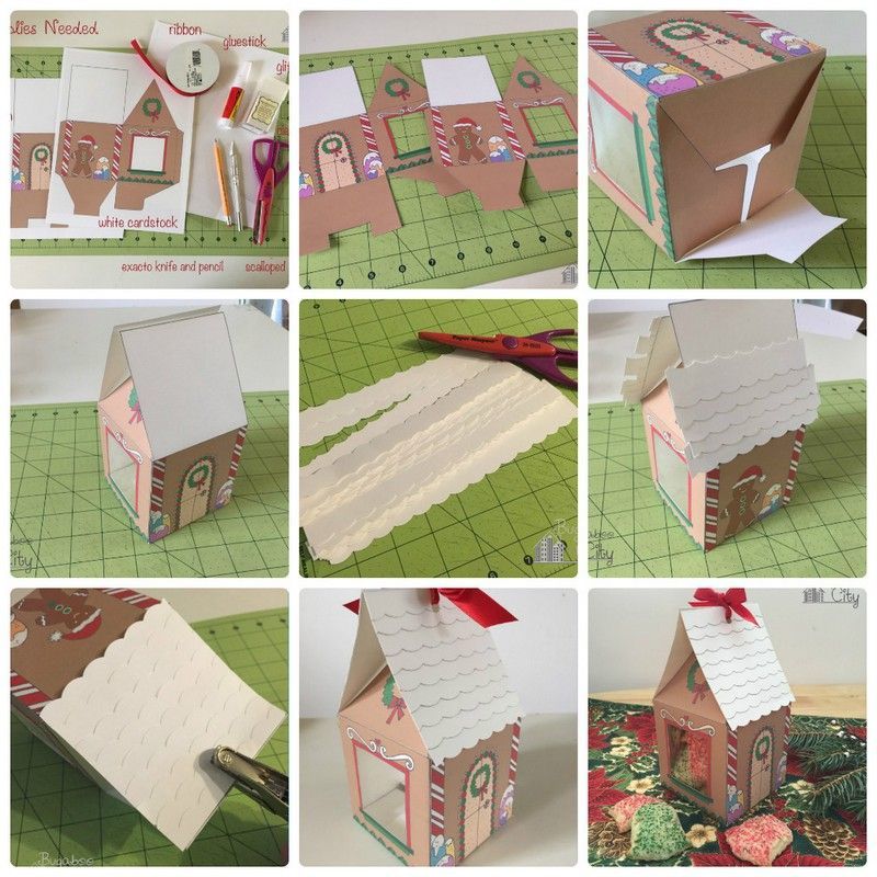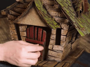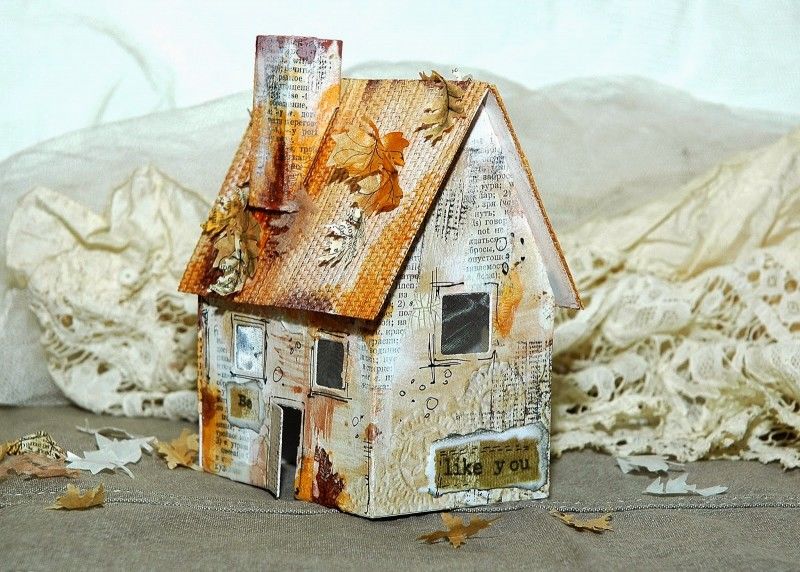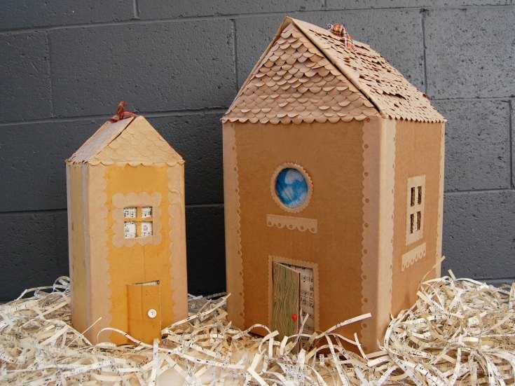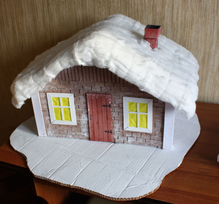 Първата стъпка е да се изрежат отворите за прозорци и врати и след това да се шлифоват ръбовете. Следващата стъпка е да покриете стените и покрива с цветна или илюстрована хартия. На покрива може да се постави комин и изрязана от картон пристройка.