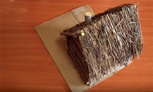 - Покривът трябва да се сглоби като отделен блок под формата на два наклона. Клонките могат да се свържат с текстуриран шнур или канап, или да се използва обикновено лепило.