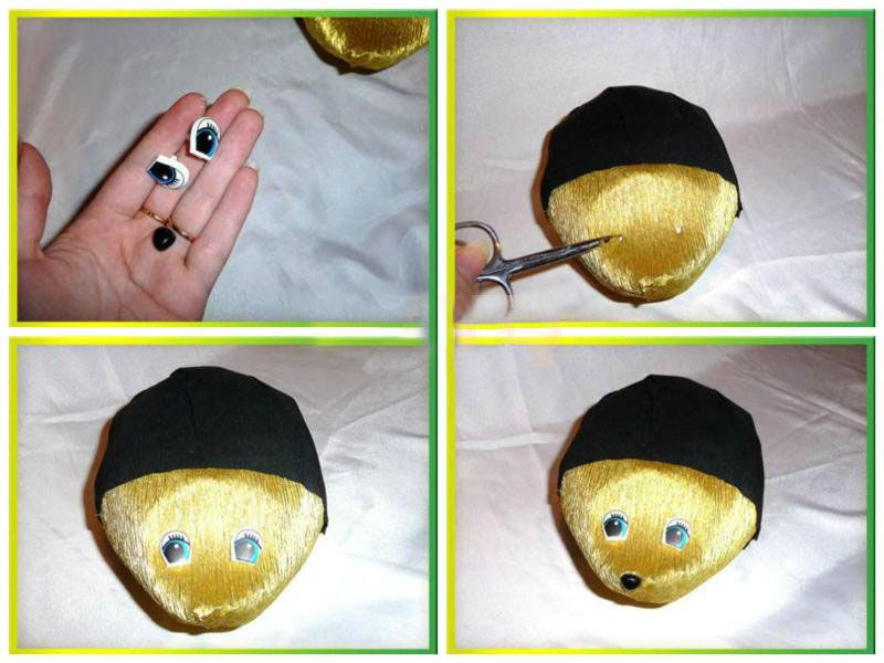 - Направете от пластилин чучур и очи и ги поставете на правилното място на муцуната.