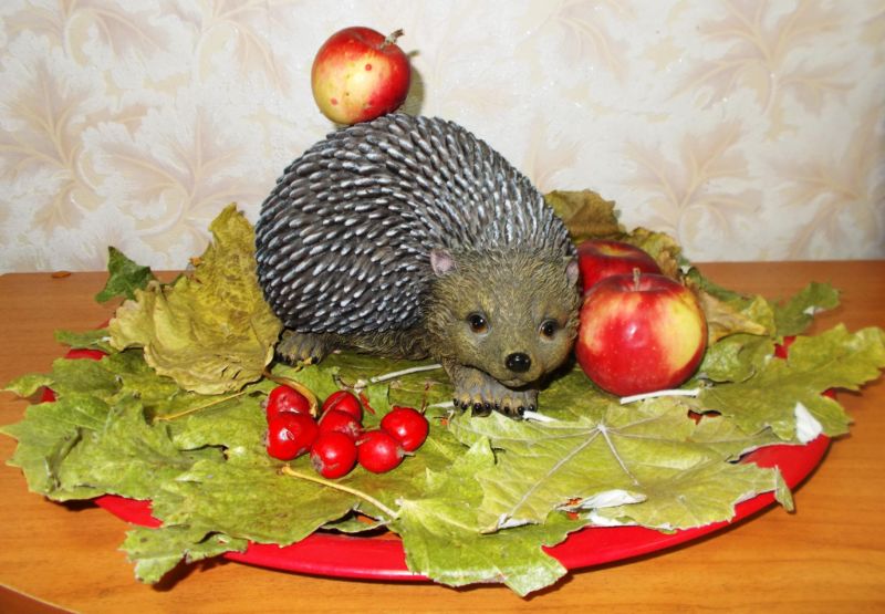 Ако направите подиум за таралежа, той също може да бъде украсен със суха трева и цветя, поставени до таралежа, изработени от пластилин, ябълки и плодове.