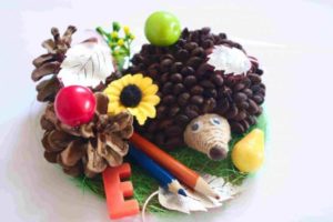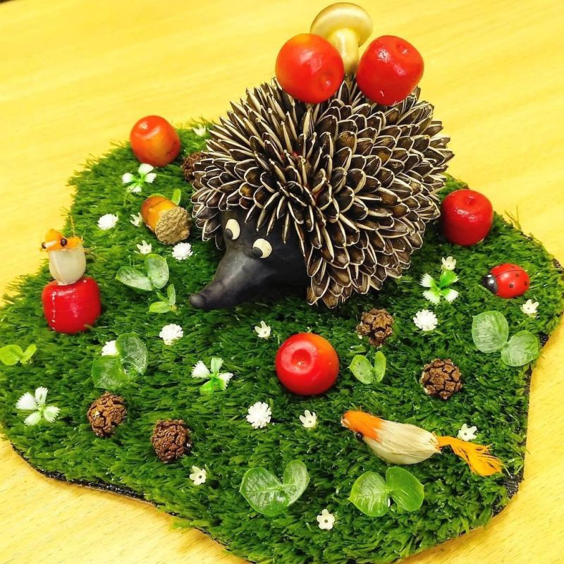 - Таралежът може да бъде поставен върху пластмасова поставка, украсена с клонки или листа.