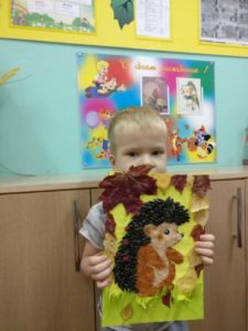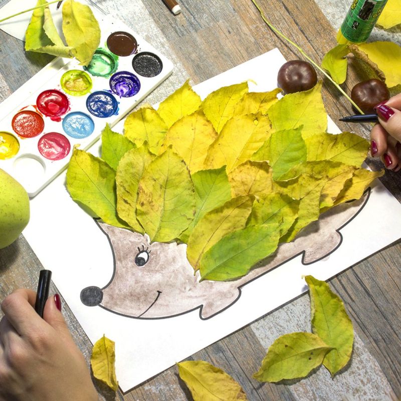 - Таралежът трябва да има крака. Те също се изрязват от хартия и се залепват за тялото. По тръните могат да се залепят плодове и гъби, есенни листа и цветя.