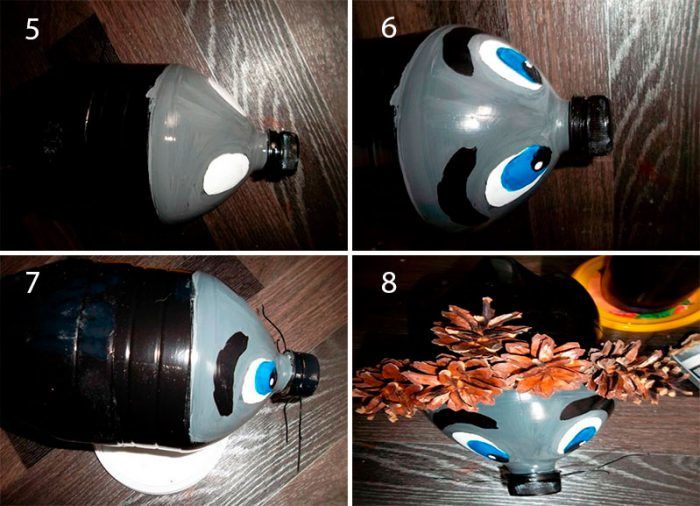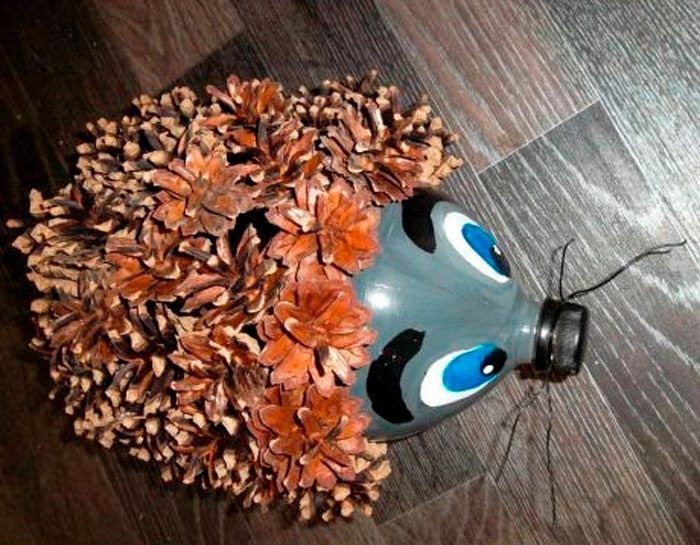 Ако искате да направите голям таралеж, можете да използвате двулитрова бутилка. Важното е да имате достатъчно кафени зърна или шишарки, за да направите бодли по цялата страна и горната част на контейнера, за да имитирате тялото на животното: