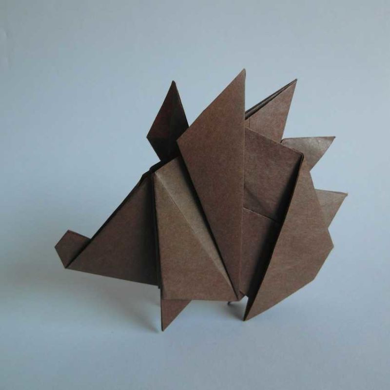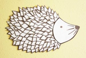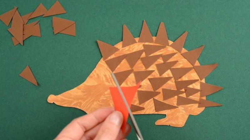 - Изрежете остри триъгълници от черна хартия и ги залепете под формата на тръни, с острия край нагоре към тялото. Или можете да изрежете шаблон от кафява хартия за тяло с шипове и да залепите главата.