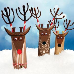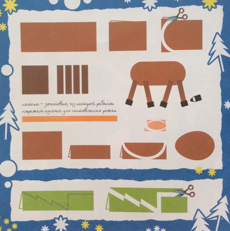 Работете с децата, за да измислят необичайни конфигурации на елени, например от геометрични фигури. Дори децата могат лесно да изрежат овал за торса, правоъгълна шия и тънки крака, кръгла глава и малки овали за рогата.