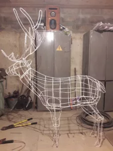 Особено красиви са осветените фигури на елени в рамка, изработени от тел. За да приготвите това коледно чудо, ще ви трябват: