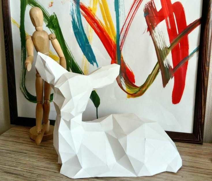 За целта с помощта на ножица изрежете от хартия (цветна, бяла или дори от вестник) всички детайли на животното - тяло, глава с рога и уши, муцуна, миниатюрни очи, нос, копита и петна.