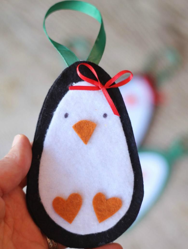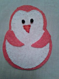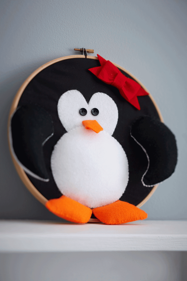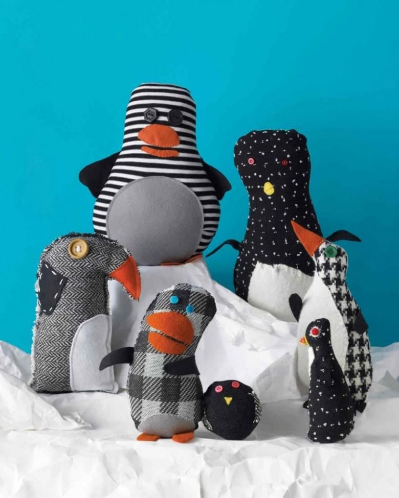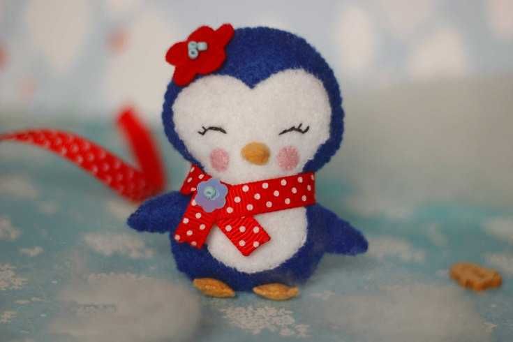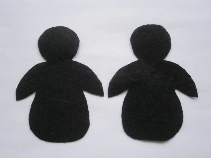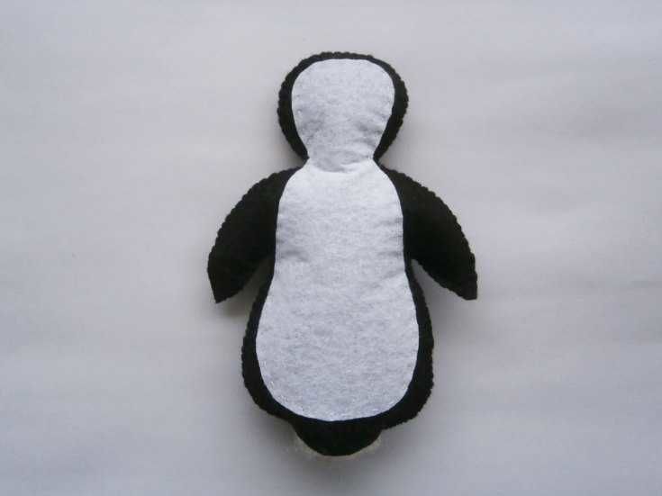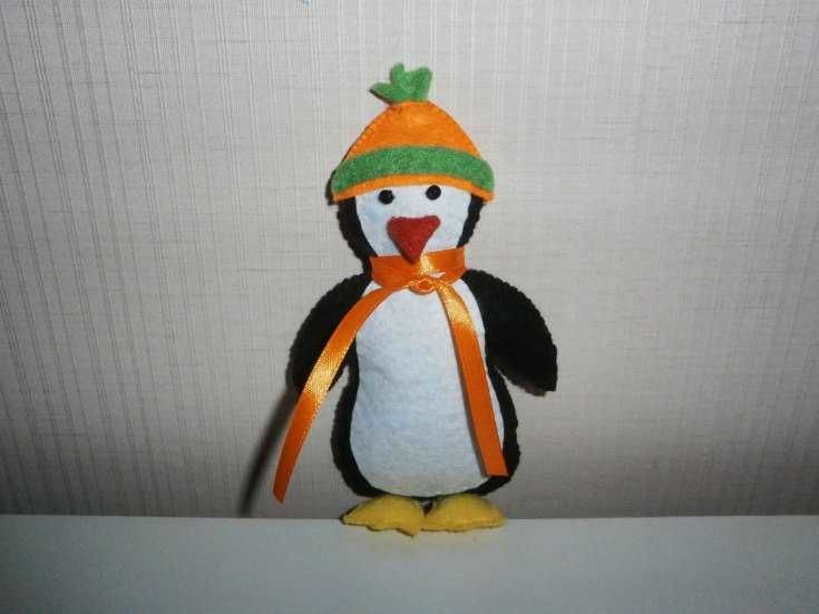 Този сладък пингвин от плат се прави бързо и заема добро място в колекцията на детето ви. За целта ни трябват бял, черен и жълт плат, за предпочитане вълнен, парче картон, памук, малки мъниста, игли и конци:
