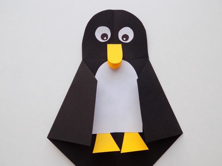 - Изрежете от бяла хартия корема и главата на пингвина във формата на кукла матрьошка. Залепете коремчето към залепения ръкав. Залепете от цветна хартия изрязан триъгълник с човка и очи.