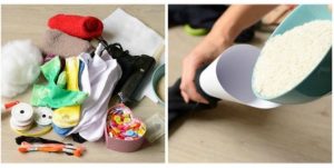 За целта ще ви трябват две пластмасови бутилки, тиксо, ножица, парче плат, PVA лепило и боя: