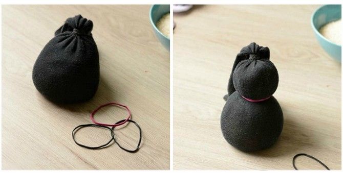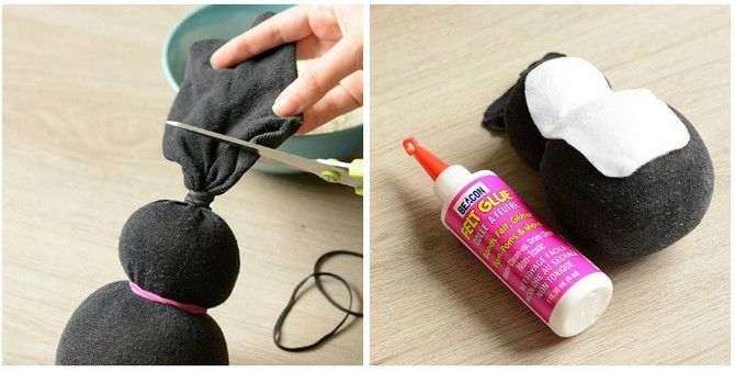 - Напълнете черния плетен чорап с памучна вата. Отделете главата от торса с конец и го навийте, като го завържете. Завържете горната част на главата на пингвина по същия начин.