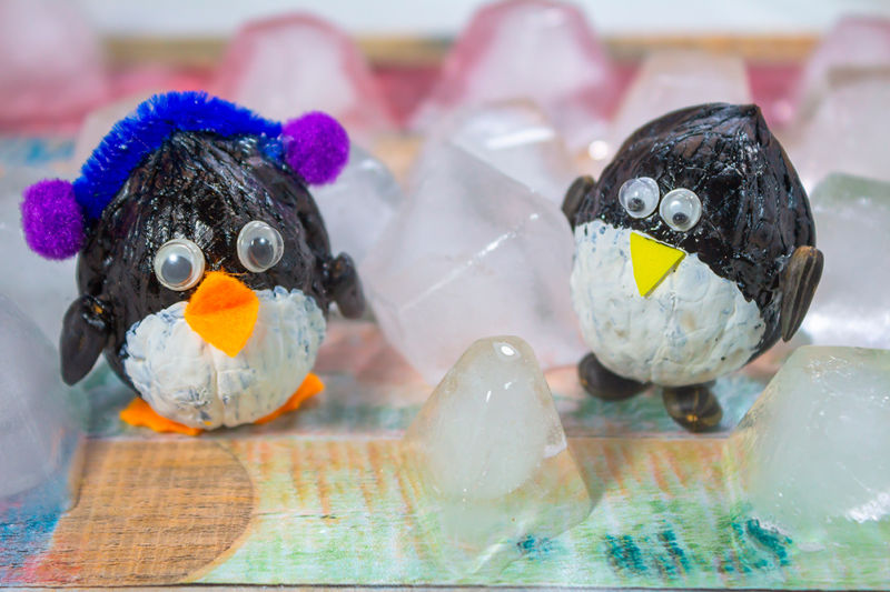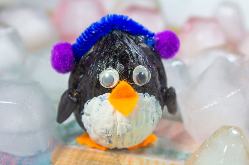 За да създадем пингвин, се нуждаем от орех, боя и глина. Оцветете ореха с боя, която да съответства на цвета на тялото на пингвина. Използвайте пластилин, за да оформите очите, краката и човката на пингвина. Прикрепете всичко към тялото на пингвина.