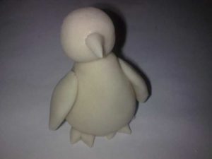 - Разточете овалната форма на корема от белия пластилин върху дъската. Прехвърлете го върху тялото на пингвина и го закрепете здраво.